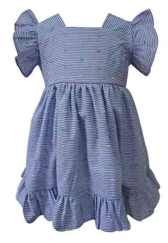 Twirl in style with this charming blue confetti stripe dress, designed to delight your little one. Featuring delicate fluttery sleeves and ruffled trim details, this dress combines playful elegance with everyday comfort. The back zipper makes dressing effortless, while the fully lined cotton construction ensures softness and breathability for all-day wear. Perfect for special occasions or casual outings, this imported piece is easy to care for with gentle hand-washing. Popatu Style: SPB-14833.