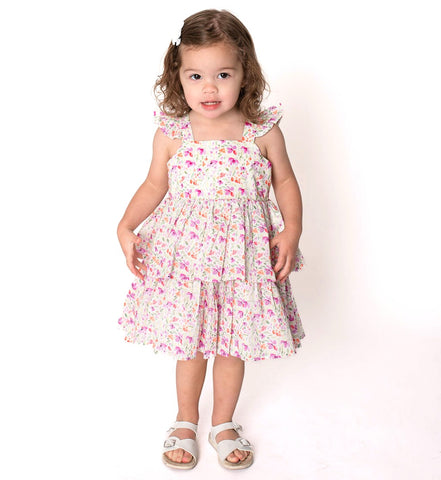 This charming tiered dress features a delicate flower print on a soft off-white background, designed for little ones from 3 to 24 months. The dress showcases a flattering layered silhouette that moves beautifully with active play. A coordinating pink cotton panty is included for convenience, while the lined construction and back zipper closure ensure easy dressing and a polished finish. (2 piece set) Popatu Style SPB-15302